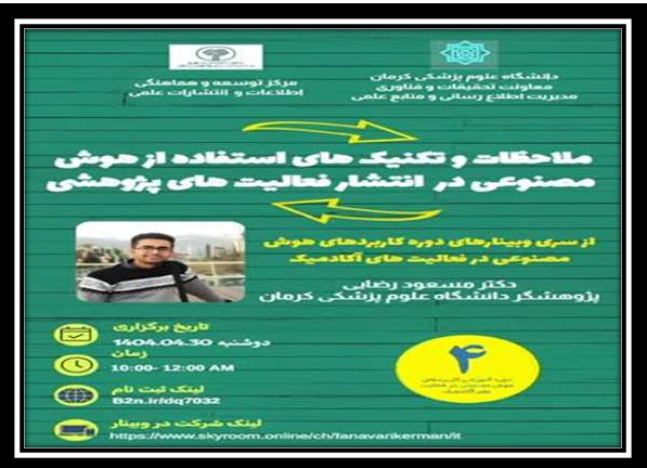 وبینار آموزشی "ملاحظات و تکنیک های استفاده از هوش مصنوعی در انتشار فعالیت های پژوهشی" از سری وبینار های دوره کاربردهای هوش مصنوعی در فعالیت های آکادمیک