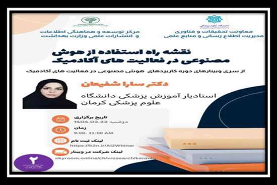 با عنایت به اهمیت توسعه دانش و آگاهی از ابزارهای هوش مصنوعی در تحقیقات و انتشارات علمی، در ادامه سلسله وبینارهای توانمند سازی هوش مصنوعی در انتشارات علمی برای پژوهشگران، مدیران و کارشناسان، مرکز توسعه و هماهنگی اطلاعات و انتشارات علمی با همکاری دانشگاه علوم پزشکی کرمان وبینار نقشه راه استفاده از هوش مصنوعی در فعالیت های آکادمیک را با سخنرانی خانم دکتر سارا شفیعیان عضو هیئت علمی دانشگاه علوم پزشکی کرمان روز دوشنبه 22 اردیبهشت ماه 1404 از ساعت 11-9 برگزار می نماید.
