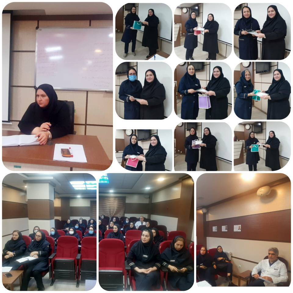 در این جلسه از زحمات کلیه همکارانیکه در موفقیت کسب امتیاز درجه یک اعتبار بخشی بیمارستان نقش موثری داشتند تقدیر بعمل آمد. همچنین در ادامه، مراسم اهداء جوایز و تقدیرنامه به برندگان و مشارکت کنندگان در مسابقه فرهنگی جشن غذا، که در روزجهانی غذا در دفتر پرستاری برگزار شده بود برگزار شد.