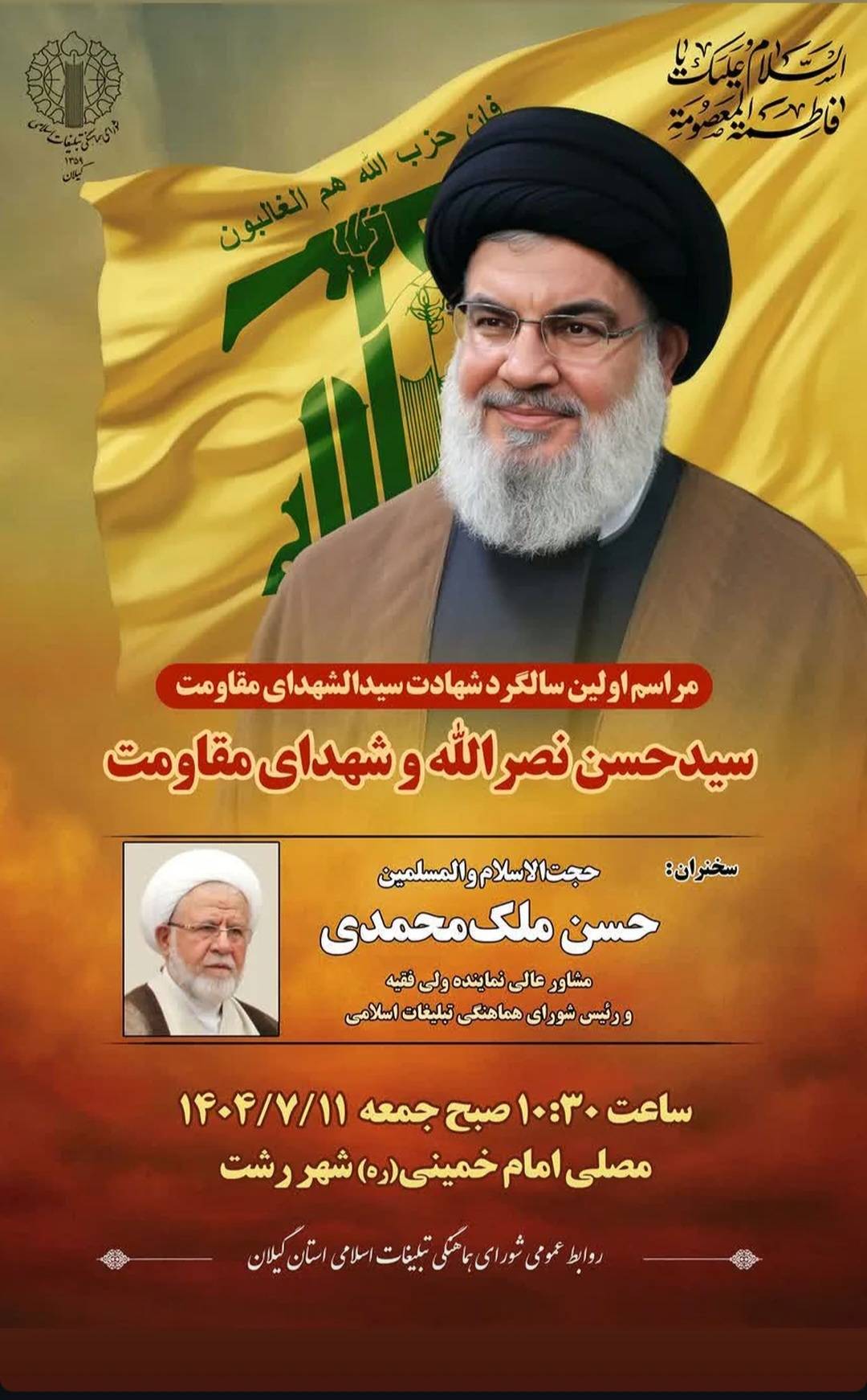 به مناسبت اولین سالگرد شهادت سیدالشهدای مقاومت، سید حسن نصرالله و شهدای مقاومت، مراسمی معنوی با سخنرانی:حجت‌الاسلام و المسلمین حسن ملک‌محمدی(مشاور عالی نماینده ولی فقیه و رئیس شورای هماهنگی تبلیغات اسلامی) برگزار می‌گردد.زمان: ساعت ۱۰:۳۰ صبح روز جمعه ۱۴۰۴/۰۷/۱۱