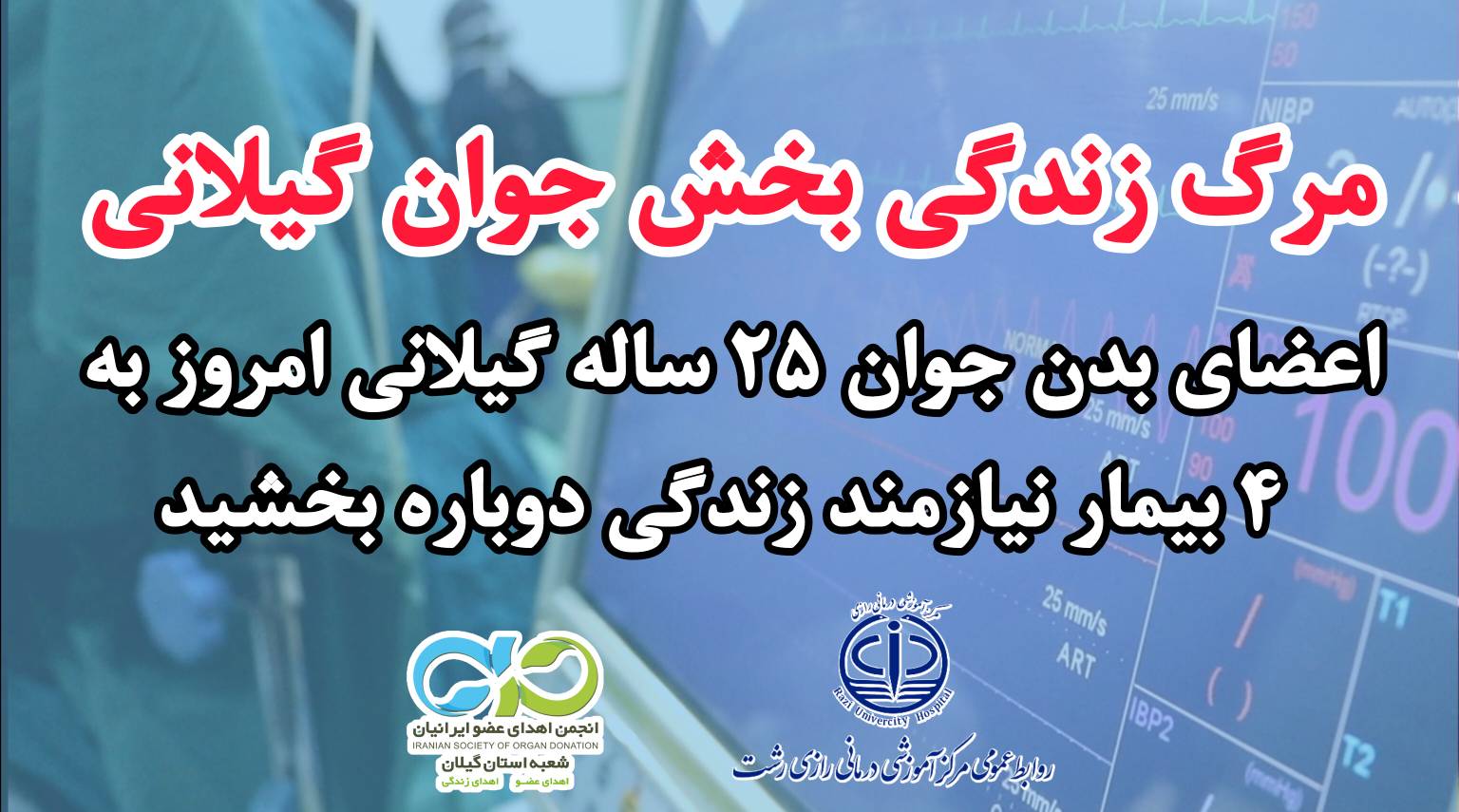 به گزارش روابط عمومی مرکز آموزشی درمانی رازی رشت، چهارمین اهدای عضو سال 1404در استان گیلان در روز سه شنبه ۶ خرداد بنام زنده یاد جانبخش سعید حاجی زاده 25 ساله، اهل شهرستان سراب، استان تبریز ثبت شد و خانواده این عزیزجانبخش، با خالق هستی بخش، معامله کرد و با رضایت خانواده بسیار فرهیخته اش ، به یک بیمار نیازمند قلب در تهران و یک بیمار نیازمند پیوند کبد و دو بیمار نیازمند پیوند کلیه در رشت، هستی و زندگی دوباره بخشید.انجمن اهدای عضو ایرانیان شعبه گیلان وظیفه خود می دانند از صمیم قلب از اساتید گرانقدر پیوندقلب بیمارستان شهید رجایی تهران، اساتید پیوند کبد و پیوند کلیه بیمارستان رازی رشت ، اساتید گرانقدر تائید کننده مرگ مغزی، اساتید نفرولوژیست، کوردیناتورهای پرتلاش و خستگی ناپذیر، همکاران خوب ICU تروما پورسینا و رازی رشت، همکاران اتاق عمل و بیهوشی رازی و آزمایشگاه و همکاران عزیز بخش پیوند کلیه و کبد تشکر و قدردانی نمایند . و این عاشقی همچنان ادامه دارد .....روحش شاد و نامش جاودان